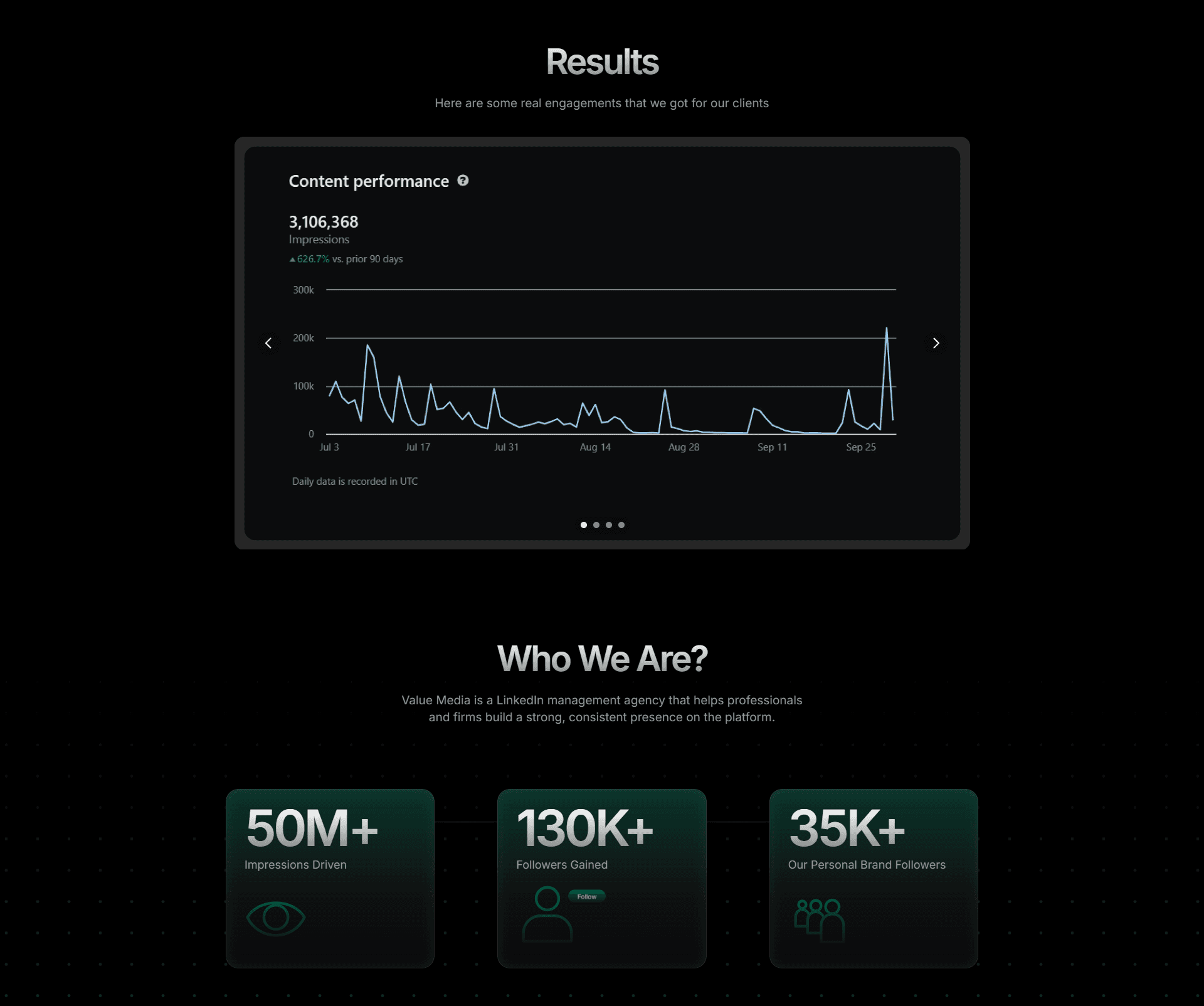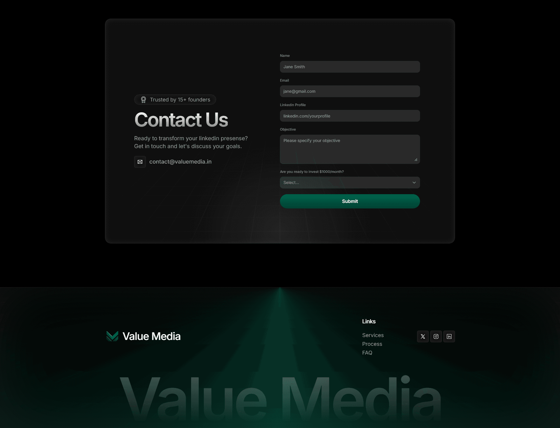 Designed and built Value Media’s one-page marketing site with custom animations, on-page SEO, and booking integration.